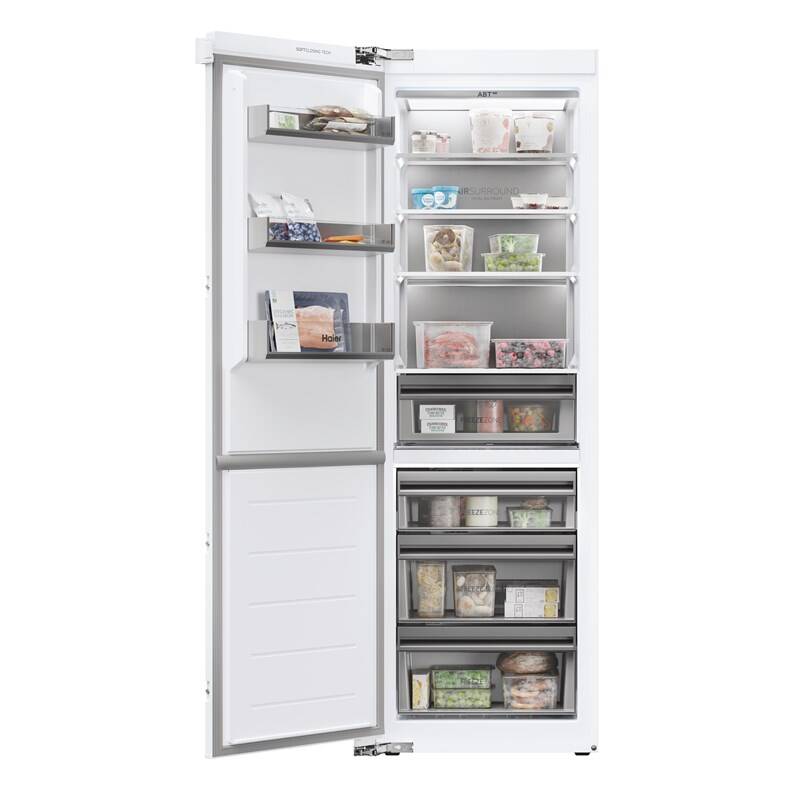 dva vestavné mrazáky haier HUT7518EWF zabudované v kuchyni s otevřenými dvířky a potravinami